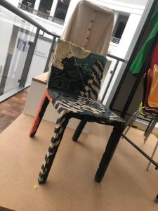 zu Bild 3: „Wir finden dieses Ausstellungsstück am besten, weil wir es erstaunlich finden, dass ein Stuhl nur aus Klamotten besteht und hält und nicht ineinander zusammenfällt.“