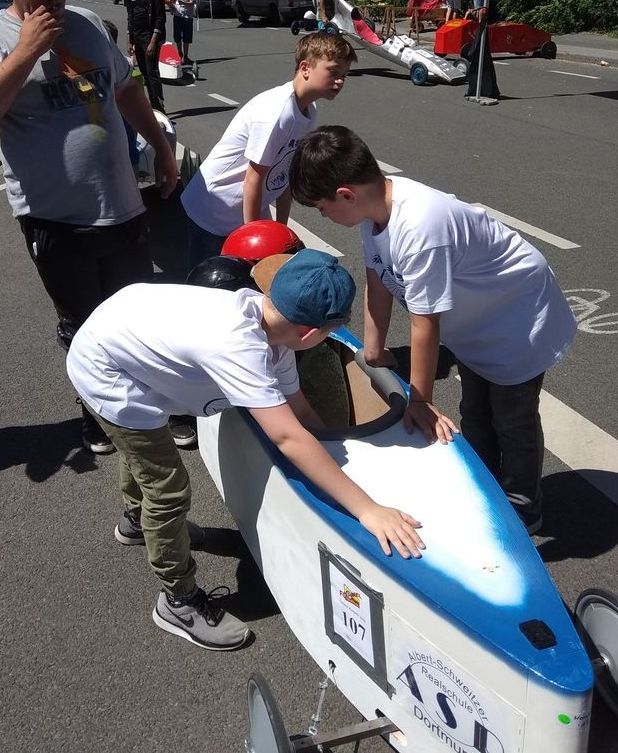 Am 30. Juni trafen sich Schulsozi Sven Eeckhout, mit der Soapbox No 1 im Schlepptau, und Calvin (5c), Marlon (6a) und Wladi (6a) sowie der engagierte und Seifenkisten-begeisterte Papa von Marlon und Calvin, um diesmal im hügeligen Kortental für die ASR anzutreten.
