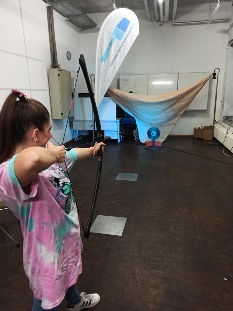 Als Vertreter der Albert-Schweitzer-Realschule bot Schulsozialarbeiter Sven Eeckhout im Eingangsbereich des Veranstaltungsgebäudes LARP-Bogenschießen an,
