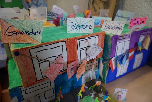 Die Schülerinnen und Schüler erkundeten nicht nur ihren eigenen Stadtbezirk, sondern beschäftigten sich ebenso mit den kulturellen Unterschieden in den Esskulturen, wobei sie auch einiges probieren konnten. Sie bastelten landestypische Gipsmasken und entwickelten Brettspiele zum Thema Fluchtwege und Integration. Die internationalen Klassen verfassten eigene Friedensgedichte, die sie auf der Abschlussfeier vortrugen.